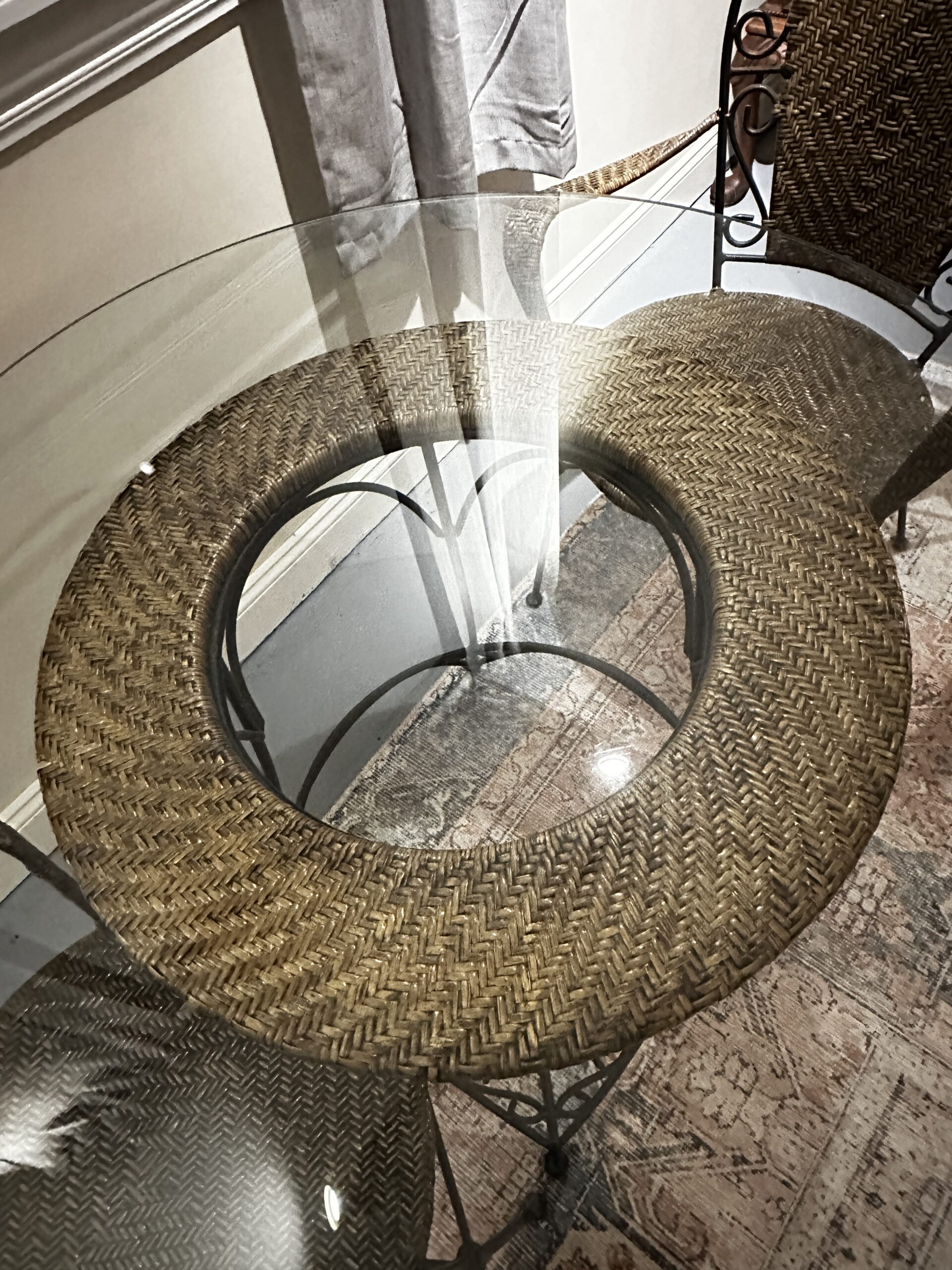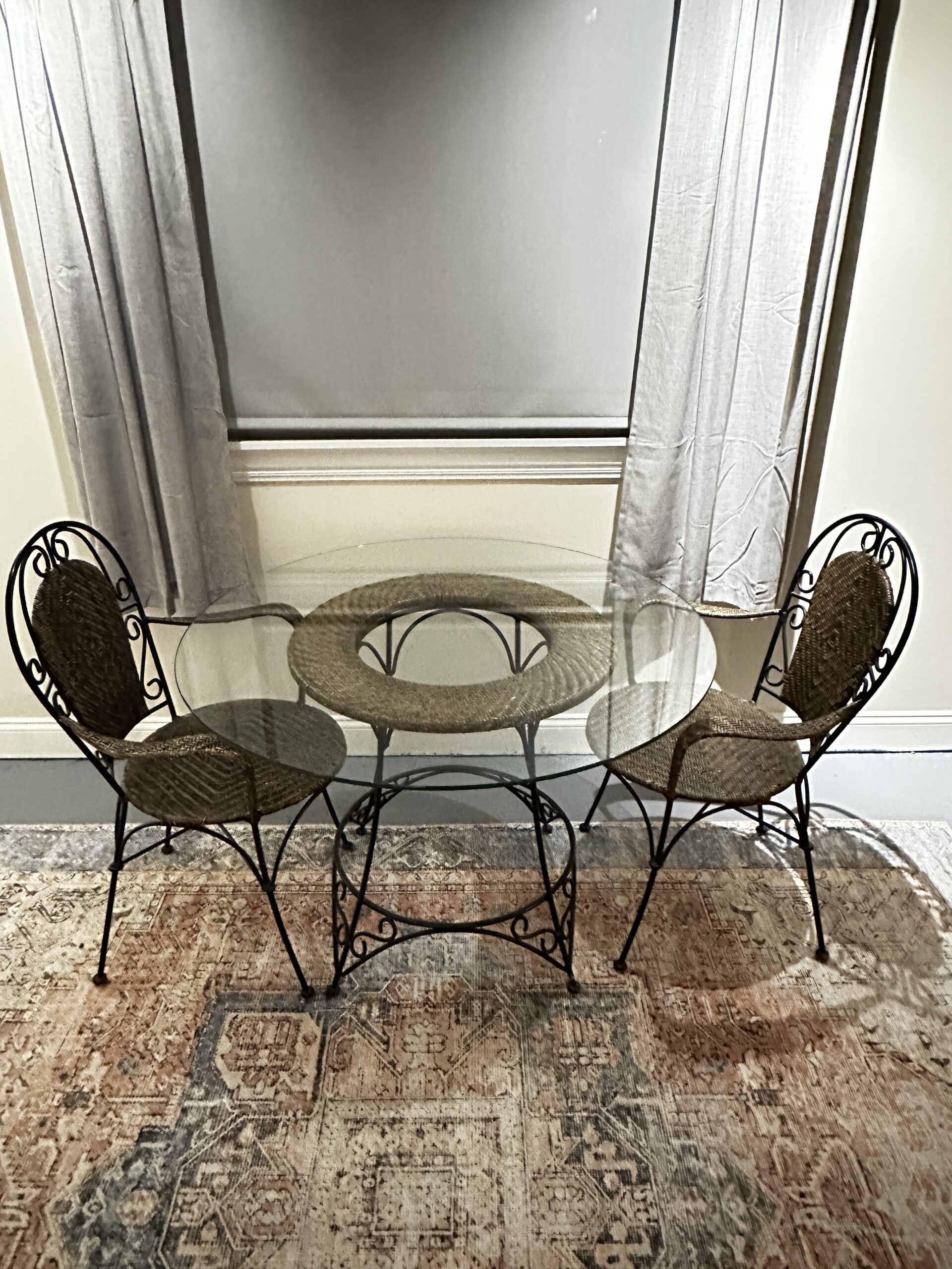 Glass table with two chairs. Simple bistro style set.