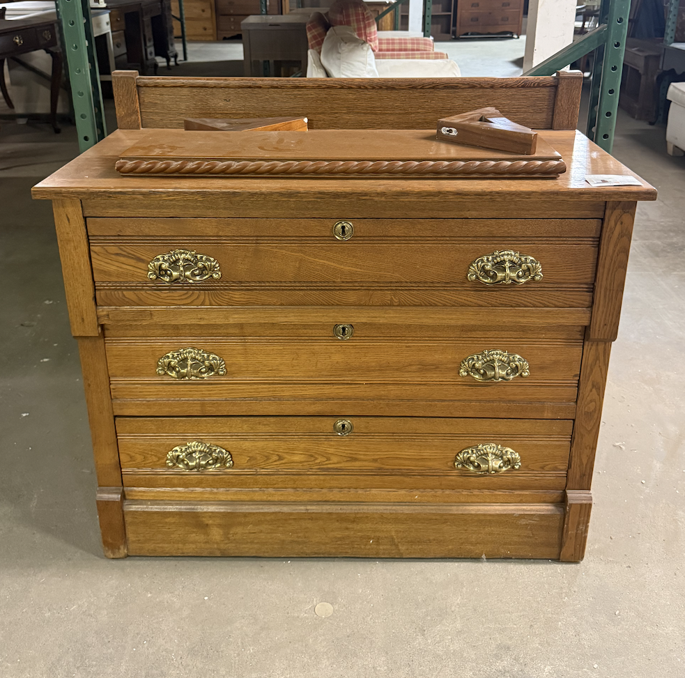 Eastlake style oak dresser with carved detailing, brass hardware, and multiple drawers. Classic antique design with solid construction.