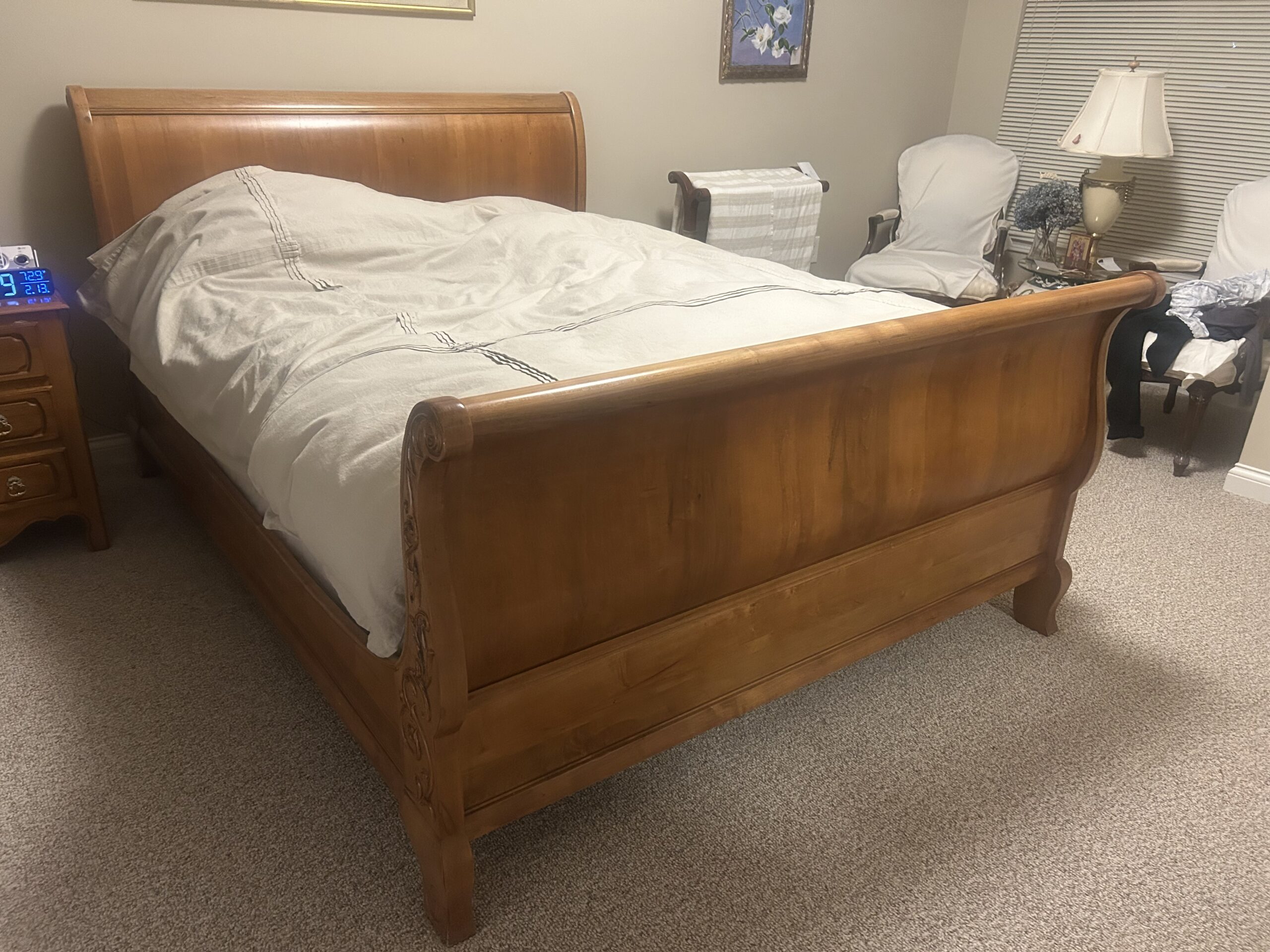 Ethan Allen queen-size wooden sleigh bed with curved headboard and footboard.
