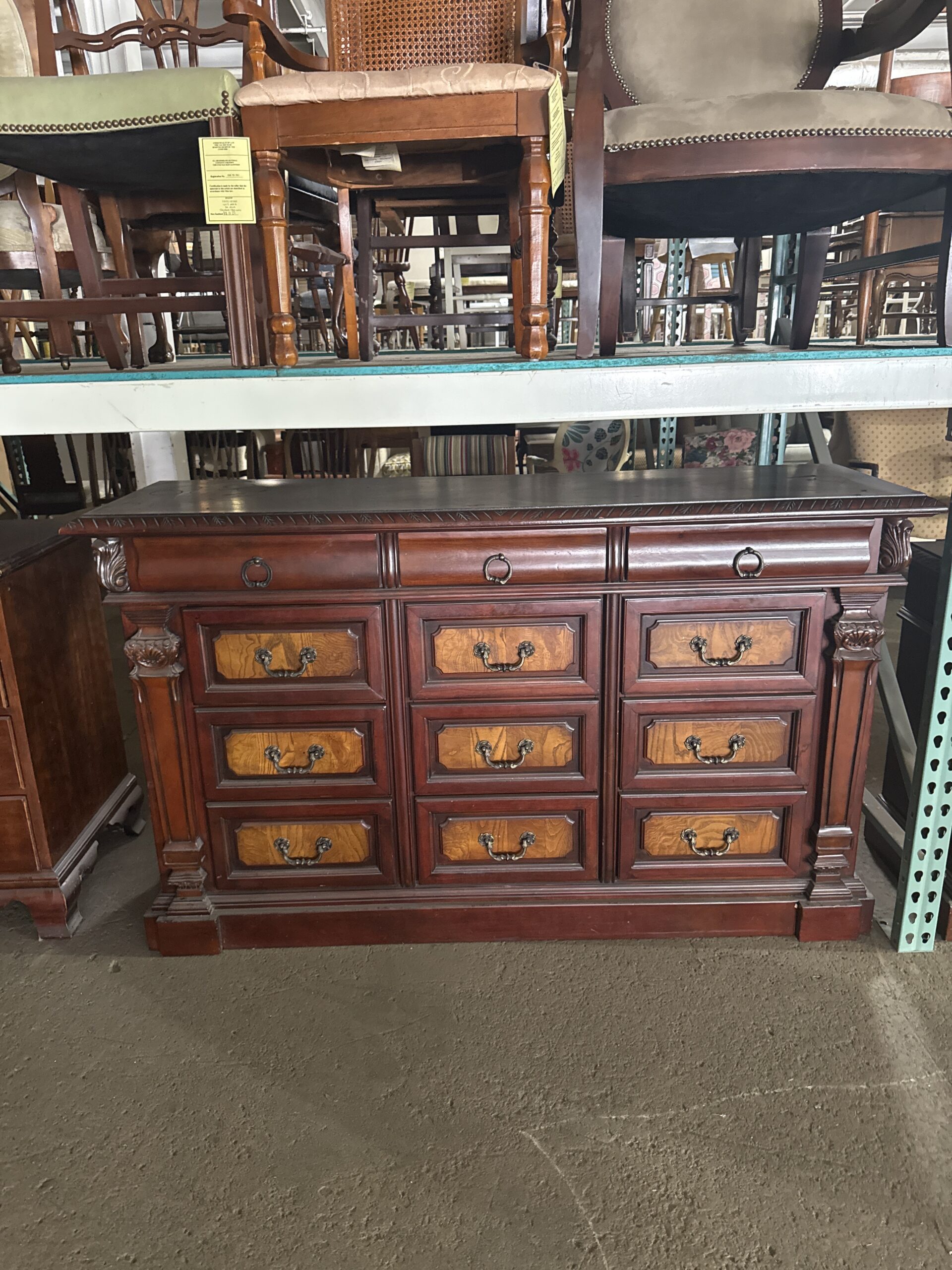 Large vintage dresser with ornate carved details and two-tone wood drawer fronts. Tons of storage with 12 drawers. Heavy and solid construction.