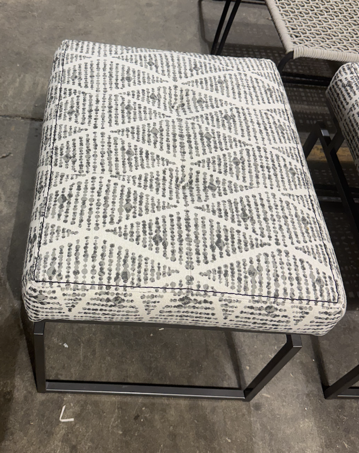 Contemporary upholstered ottoman featuring a soft, cushioned top wrapped in a neutral gray and ivory geometric pattern. The tailored piping detail adds structure and polish, while the sleek black metal base provides a clean, architectural foundation. Perfect as a footrest, extra seating, or a stylish accent piece in a living room, bedroom, or office setting.