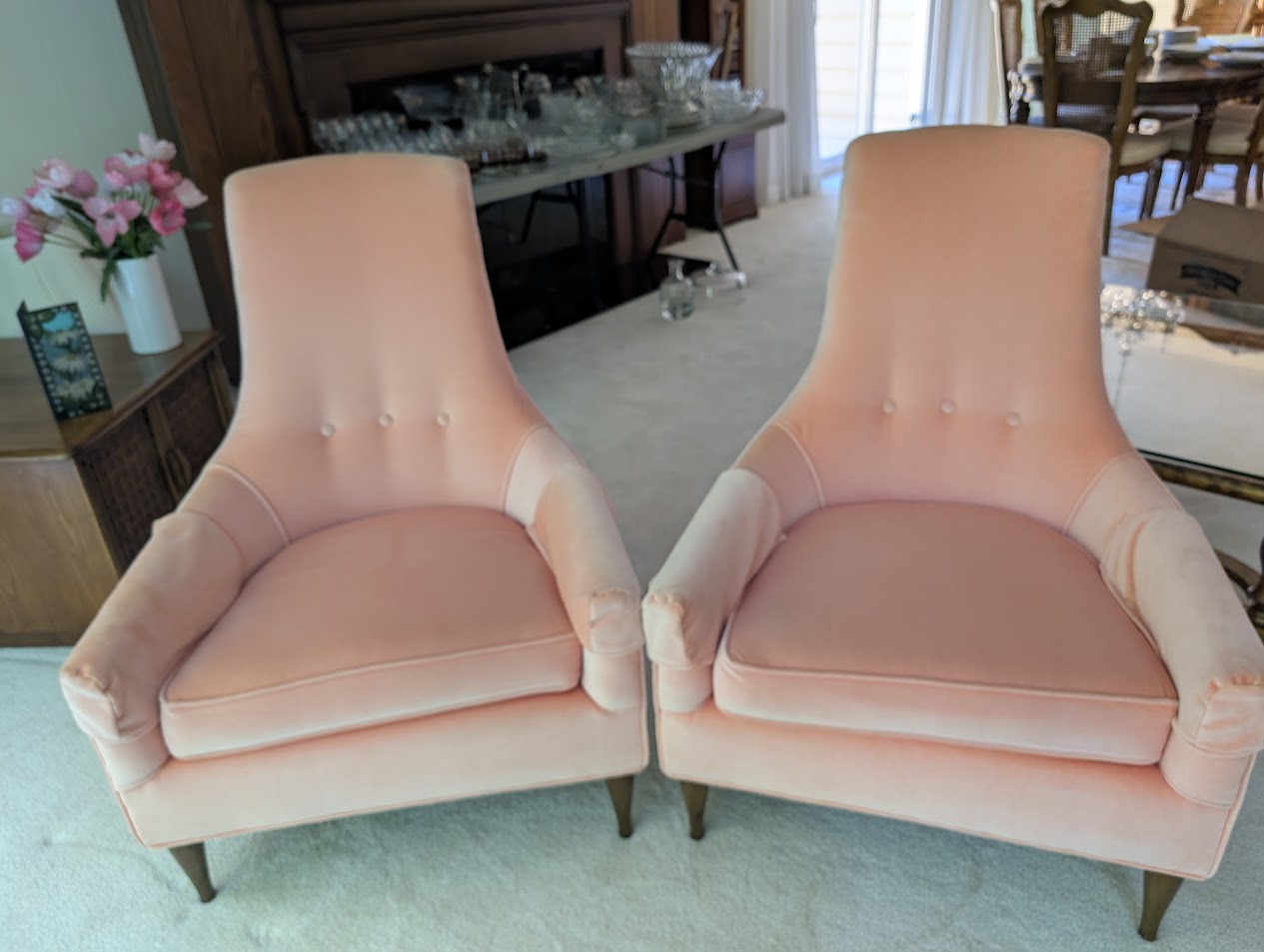 Pair of blush pink upholstered accent chairs with high backs, button tufting, and tapered wood legs.