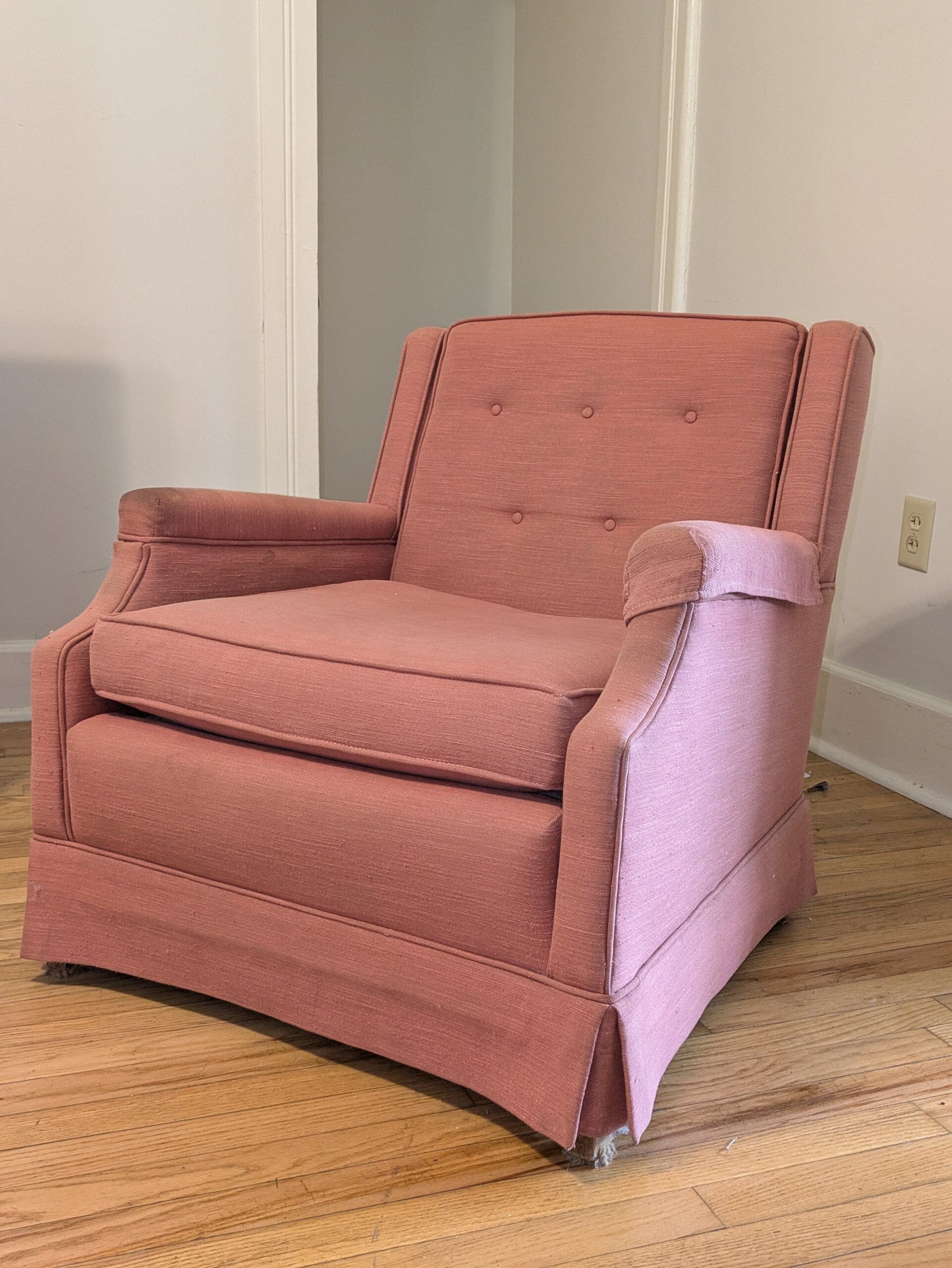 Pair of pink mid century armchairs with tufted backs, rolled arms, and cushioned seats. Classic vintage style with comfortable design.