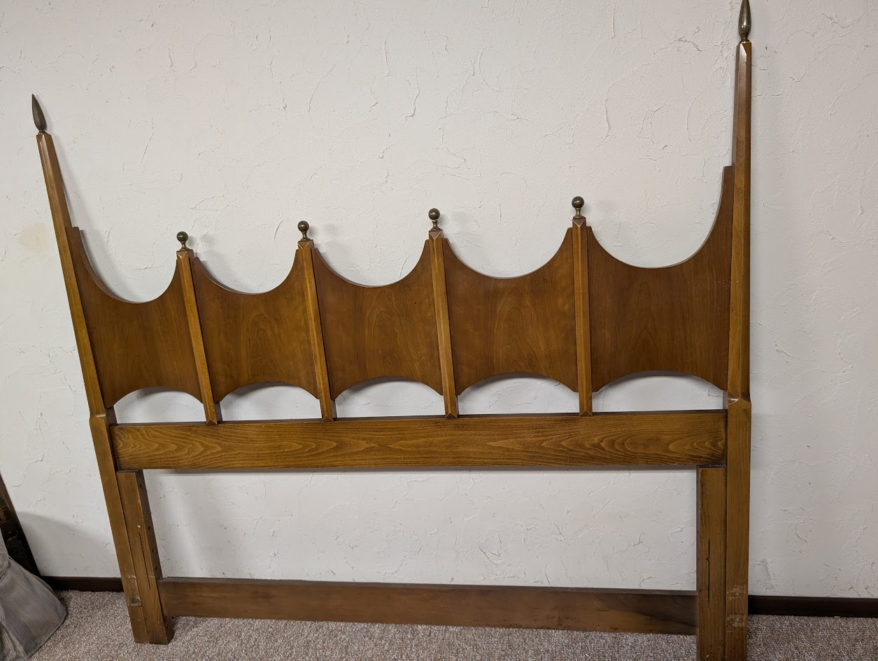 Vintage wood headboard with scalloped arch design and decorative finials.