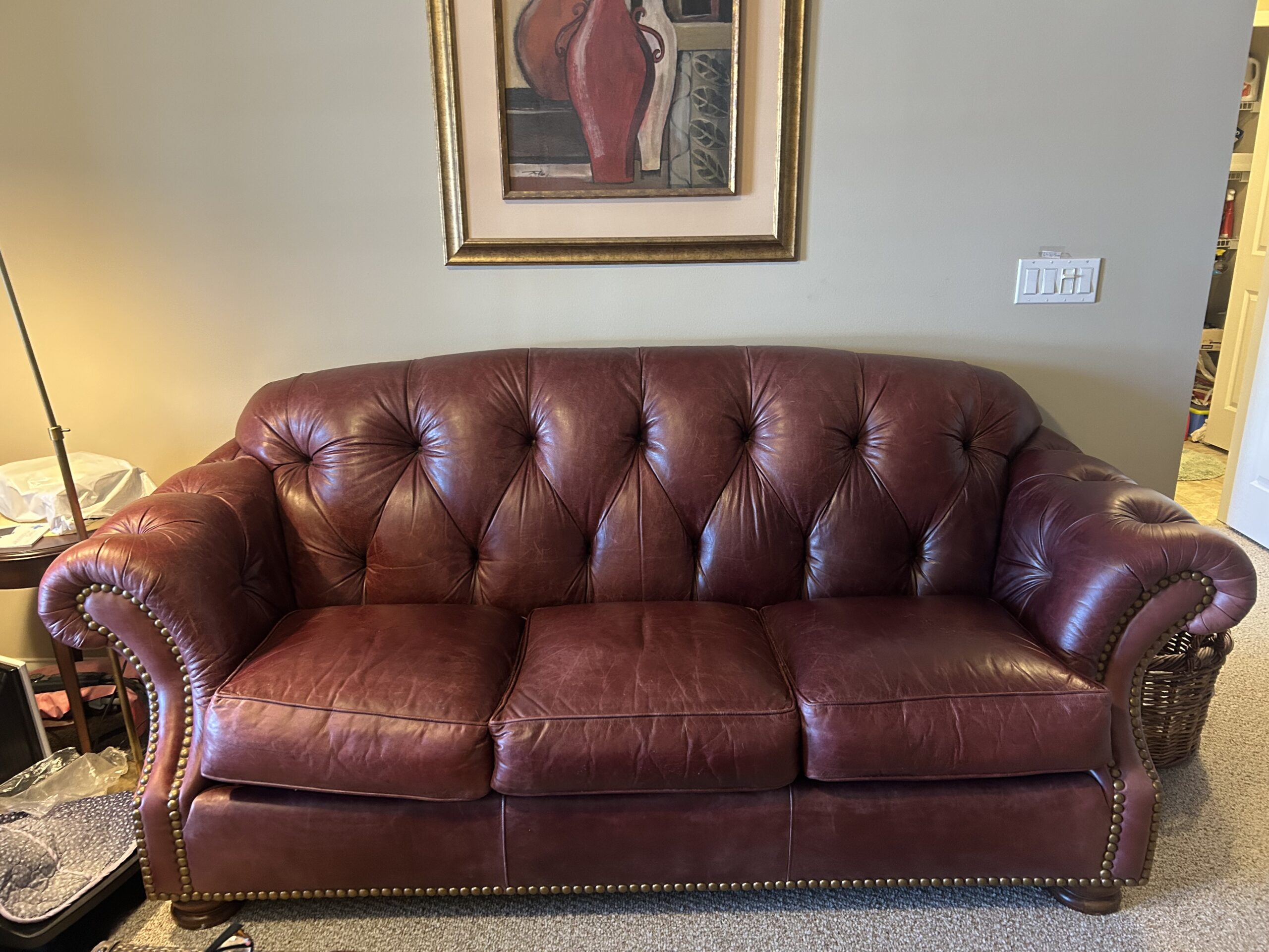 Tufted burgundy leather sofa.