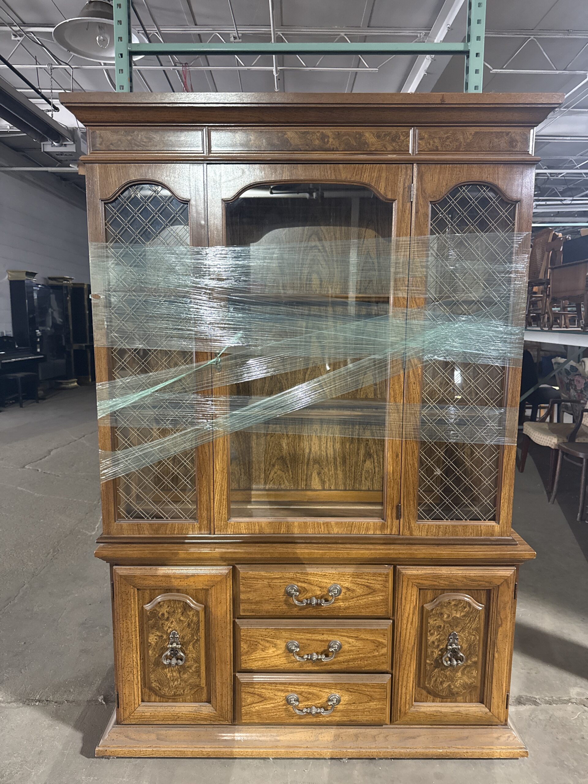 Solid wood, two-piece hutch with glass doors, lattice detail, and lower drawer storage. Great for display or storage with a classic vintage look.
